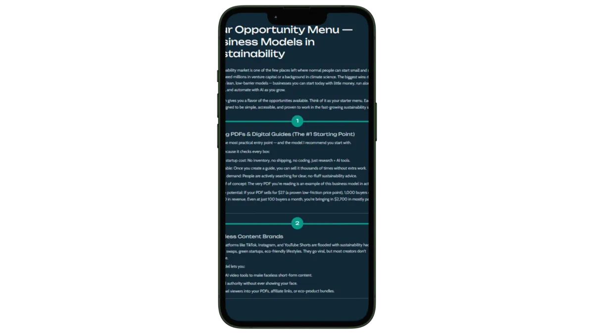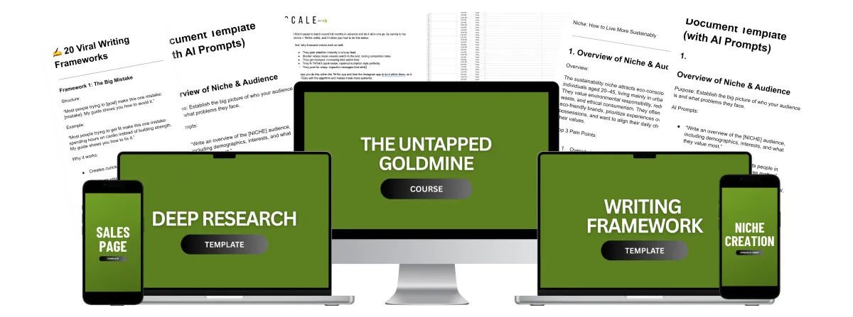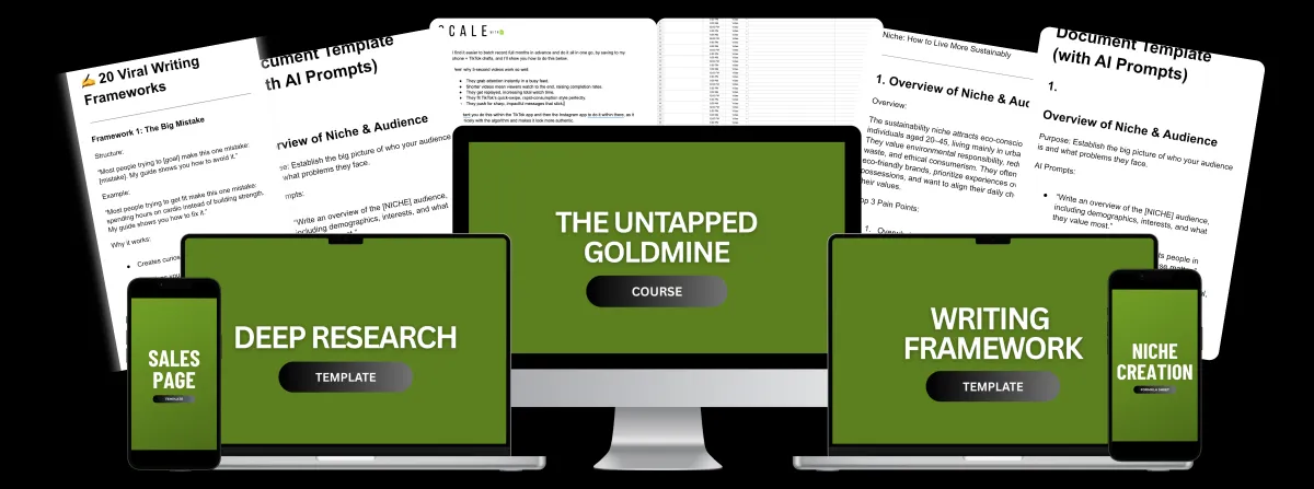 The Untapped Goldmine is a complete system that shows you how to create and scale digital businesses in the sustainability industry without showing your face. You'll learn exactly how I built 15+ profitable accounts, from choosing winning niches to creating 5-second viral videos. Everything is step-by-step, so you can copy my proven system.